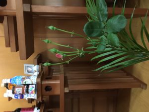 奇しくも昨日は教会玄関にあるバラ、御結界の窓の外にあるナンテン、そして御神前裏手にあるアジサイが一斉に開花した一日となりました(バラは金ちゃんが切って御神前に移しました)。宗教法人格取得はいわば教会としての独り立ちということですが、この成り行きに乗ってお互いの信心の上にも、独り立ちへ向けて開花のおかげを頂いてまいりたいと願わせて頂きます。