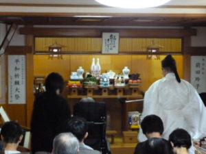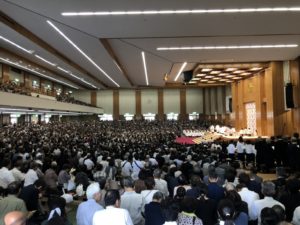 1時30分、金光浩道(ひろみち)先生ご祭主のもと約1時間にわたって御祭典が厳かに仕えられ一同、その御比礼に浴させて頂きました。総収容人数約15,000人の祭場は1階も2階も超満員で立ち見で御祭典を拝まれる人も多数おられるほどでした。